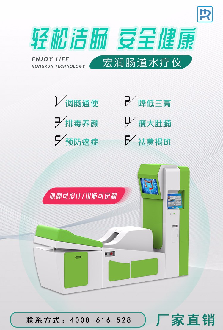 肠道水疗俗称“洗肠”,是一种“清理为先、调理为后、慢病快治”的肠道保养方案。能彻底清除肠道宿便毒素。安全无痛苦,轻松舒适,您可亲眼看见自己排出体外的毒素垃圾。这是一种能彻底清洗肠道,排出体内毒素,改善便秘、纠正腹泻、调节肠道菌群失调,并有美颜、美肤、肥减腹、调节内分泌失调等作用的新型保健疗法。开创性的加入红光热疗系统进一步提升肠道疾病治疗。厂家订购咨询热线:4008-616-528