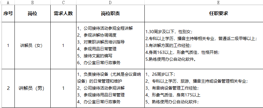 2、大型机械厂招聘:讲解员2名,女,30周岁以下,163cm以上,普通话甲级二等;男,26周岁以下,175cm以上,有音响设备管理经验;专科以上学历,熟练使用办公自动化软件;5天8小时,缴纳社保,月均4000-5500元